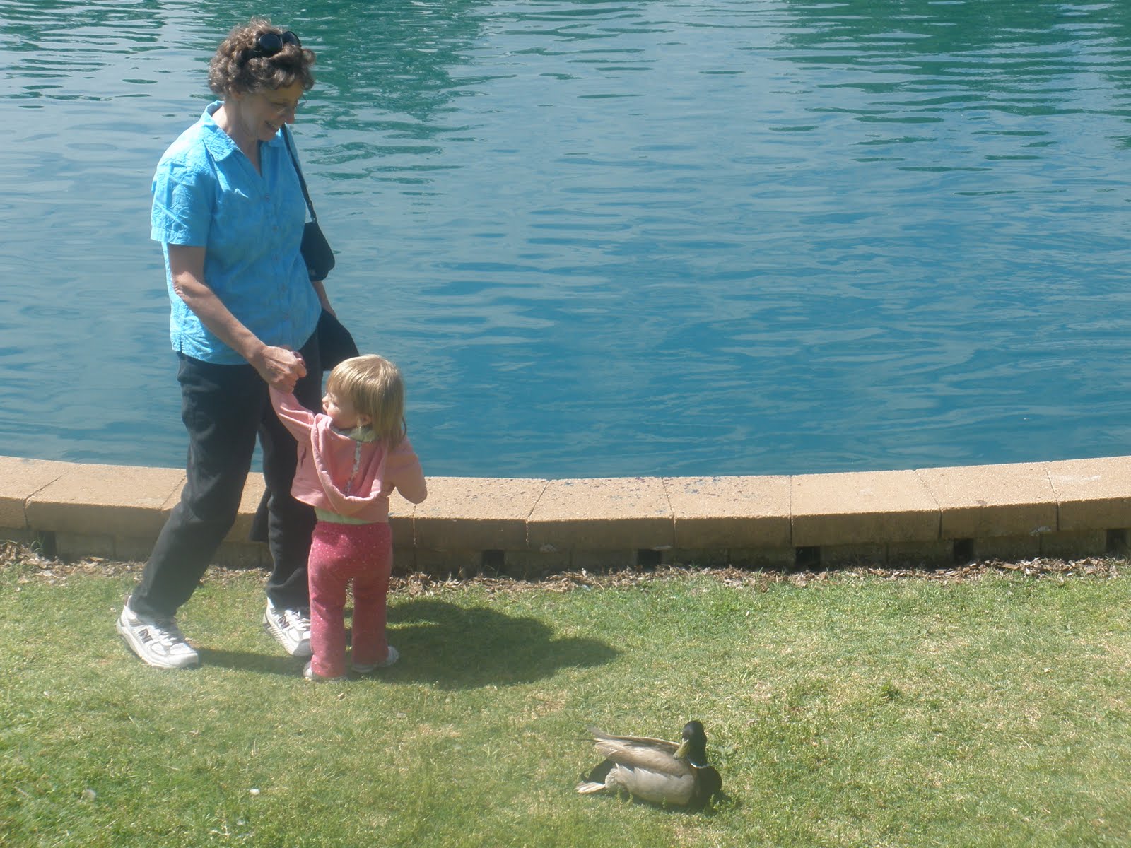 With Bibi and Papa by the pond. Laurel is in this phase where she will squat down, put her hands on her knees, and give you a cheesy smile. She's not looking, but that's what she's doing here!